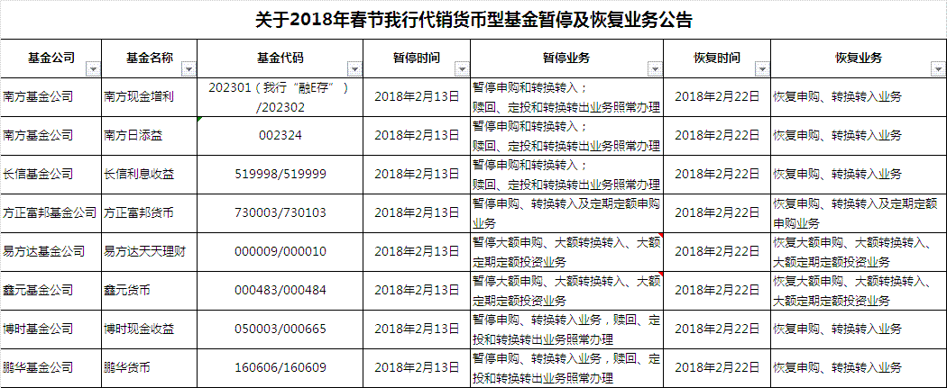 1、2018年2月13日至2月21日,根據(jù)各基金公司通知,為保護基金份額持有人權(quán)益部分貨幣型基金業(yè)務(wù)將暫停,2018年2月22日,各項業(yè)務(wù)將恢復(fù)正常,屆時不再公告,最終以基金公司發(fā)布公告為準。