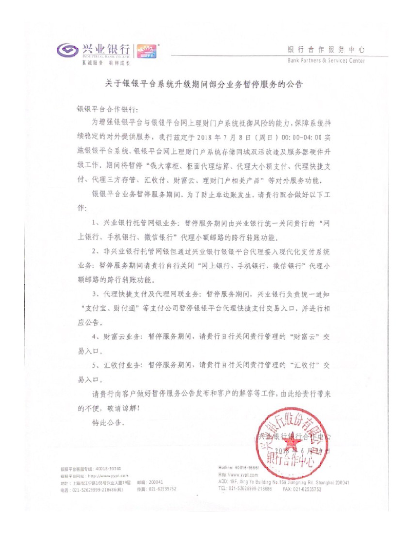 轉(zhuǎn)發(fā)關(guān)于《銀銀平臺系統(tǒng)升級期間部分業(yè)務(wù)暫停服務(wù)的公告》