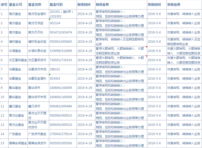 (1)2019年04月29日至2019年05月05日,根據(jù)各基金公司安排為保護基金份額持有人貨幣型基金業(yè)務(wù)將暫停,2019年05月06日起將恢復(fù)辦理正常的申購及轉(zhuǎn)換轉(zhuǎn)入業(yè)務(wù),屆時將不再另行公告?;饡和I曩徏稗D(zhuǎn)換轉(zhuǎn)入業(yè)務(wù)期間,其他業(yè)務(wù)仍正常辦理。