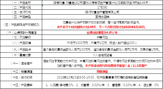 我行將于2019年10月23日代銷《招商財富-財富寶182天理財10號專項資產(chǎn)管理計劃(本期實際運作天數(shù)149天)》,產(chǎn)品募集期2019年10月23日