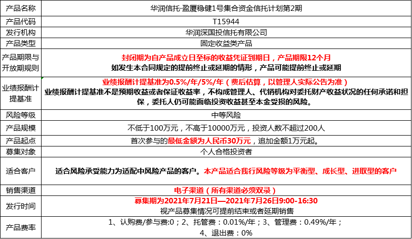 華潤信托-盈廈穩(wěn)健1號集合資金信托計劃第2期 日期:2021-07-20 15:11:53 我行于2021年7月代銷《華潤信托-盈廈穩(wěn)健1號集合資金信托計劃第2期》,產品信息如下: (認購渠道:廈門銀行各網點) 合格投資者范圍及收費方式、收費標準詳見銷售文本。 本產品由華潤深國投信托有限公司發(fā)行與管理,代銷機構不承擔產品的投資、兌付和風險管理責任。 廈門銀行全國客戶服務電話:400-858-8888 理財非存款 產品有風險 投資需謹慎 上一篇 返回 下一篇