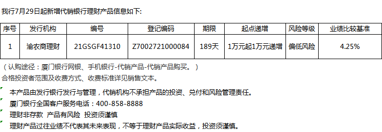 廈門銀行7月29日代銷渝農(nóng)商理財理財產(chǎn)品信息