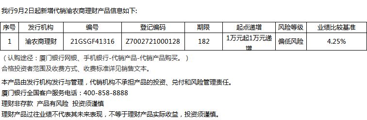 廈門銀行9月2日代銷渝農(nóng)商理財(cái)產(chǎn)品信息