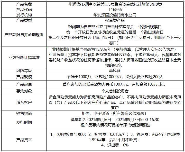 我行于2021年9月代銷(xiāo)《華潤(rùn)信托·潤(rùn)享收益憑證5號(hào)集合資金信托計(jì)劃第3期B類(lèi)》,產(chǎn)品信息如下: