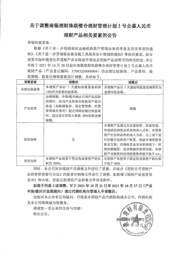 關(guān)于調(diào)整南銀理財(cái)珠聯(lián)璧合理財(cái)管理計(jì)劃2號公募人民幣理財(cái)產(chǎn)品相關(guān)要素的公告 日期:2021-10-14 18:18:31 上一篇 返回 下一篇