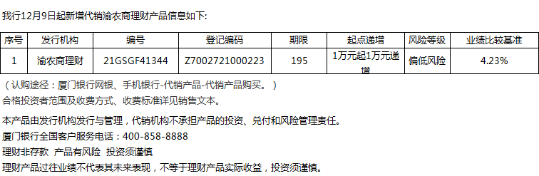 廈門銀行12月9日代銷渝農(nóng)商理財產(chǎn)品信息