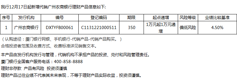 廈門銀行12月17日代銷廣州農(nóng)商銀行理財(cái)產(chǎn)品信息