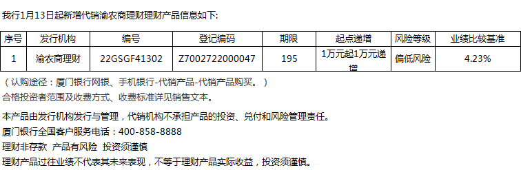 廈門銀行1月13日代銷渝農(nóng)商理財(cái)理財(cái)產(chǎn)品信息