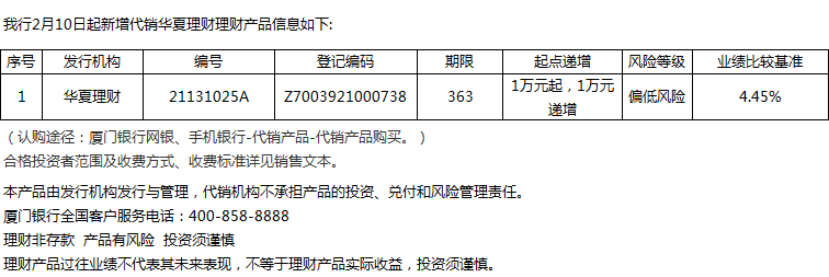 廈門銀行2月10日代銷華夏理財理財產(chǎn)品信息