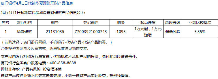 廈門銀行4月1日代銷華夏理財理財產品信息