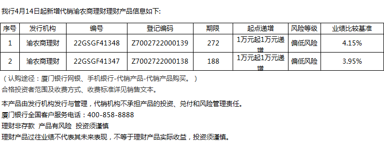 廈門銀行4月14日代銷渝農(nóng)商理財(cái)理財(cái)產(chǎn)品信息