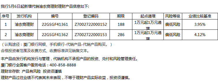 廈門(mén)銀行5月6日代銷渝農(nóng)商理財(cái)理財(cái)產(chǎn)品信息