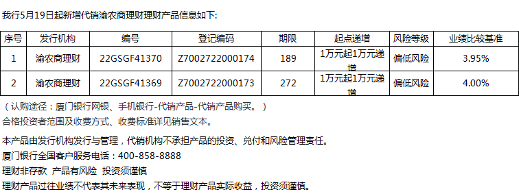 廈門銀行5月19日代銷渝農(nóng)商理財(cái)理財(cái)產(chǎn)品信息
