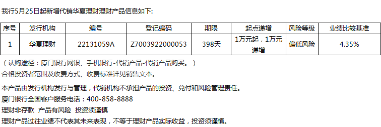 廈門銀行5月25日代銷華夏理財理財產品信息