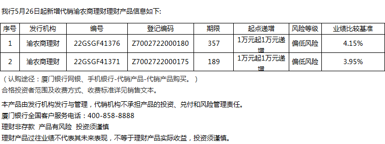 廈門銀行5月26日代銷渝農(nóng)商理財理財產(chǎn)品信息