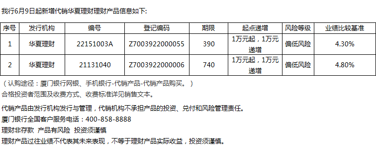 廈門銀行6月9日代銷華夏理財(cái)理財(cái)產(chǎn)品信息