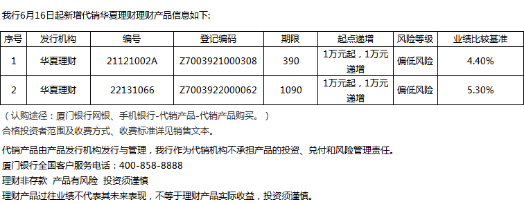 廈門銀行6月16日代銷華夏理財(cái)理財(cái)產(chǎn)品信息