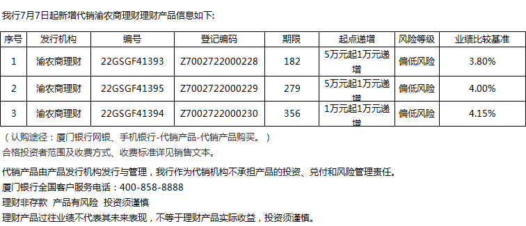 廈門銀行7月7日代銷渝農(nóng)商理財理財產(chǎn)品信息