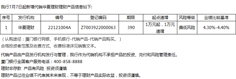 廈門銀行7月7日代銷華夏理財(cái)理財(cái)產(chǎn)品信息