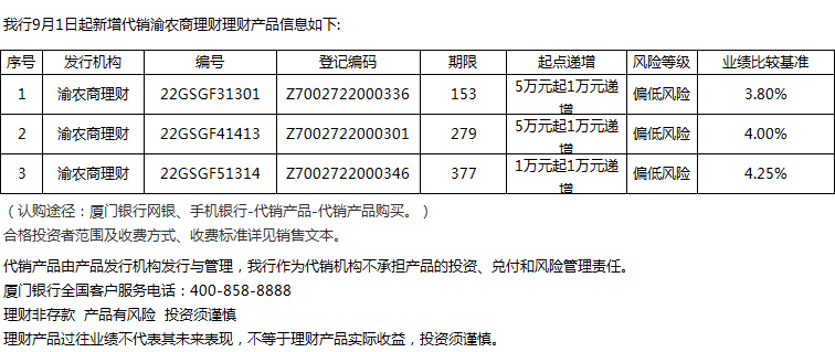 廈門銀行9月1日代銷渝農(nóng)商理財(cái)理財(cái)產(chǎn)品信息