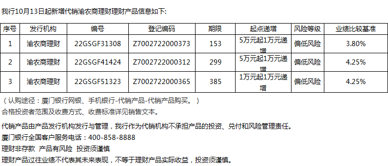 廈門銀行10月13日代銷渝農(nóng)商理財(cái)理財(cái)產(chǎn)品信息