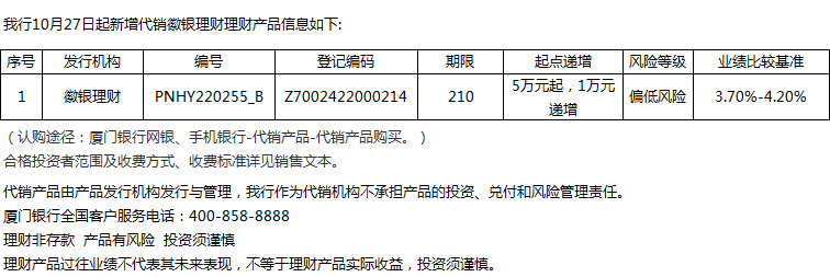 廈門銀行10月27日代銷徽銀理財(cái)理財(cái)產(chǎn)品信息