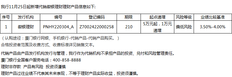 廈門銀行11月25日代銷徽銀理財理財產(chǎn)品信息