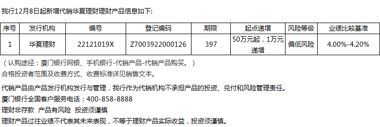 廈門銀行12月8日代銷華夏理財理財產(chǎn)品信息