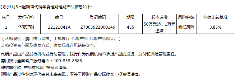 廈門銀行1月5日代銷華夏理財(cái)理財(cái)產(chǎn)品信息