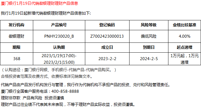 廈門銀行1月19日代銷徽銀理財理財產品信息