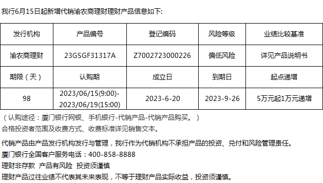 廈門銀行6月15日代銷渝農(nóng)商理財理財產(chǎn)品信息