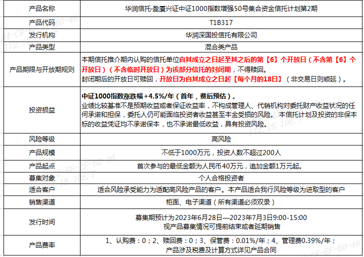 我行將代銷《華潤信托·盈廈興證中證1000指數(shù)增強50號集合資金信托計劃第2期》,產(chǎn)品信息如下: