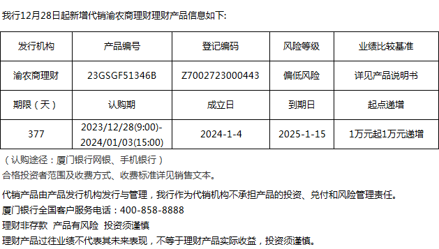 廈門銀行12月28日代銷渝農(nóng)商理財理財產(chǎn)品信息