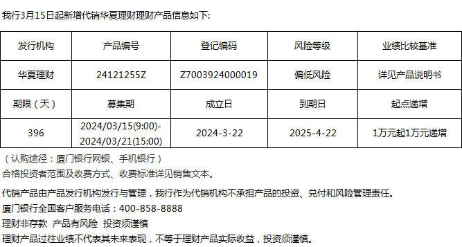 廈門銀行3月15日代銷華夏理財(cái)理財(cái)產(chǎn)品信息