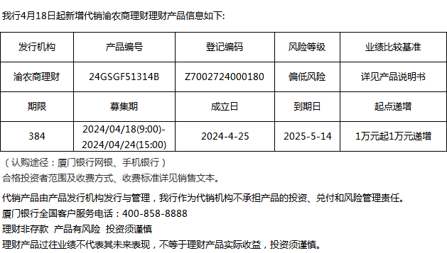 廈門(mén)銀行4月18日代銷渝農(nóng)商理財(cái)理財(cái)產(chǎn)品信息