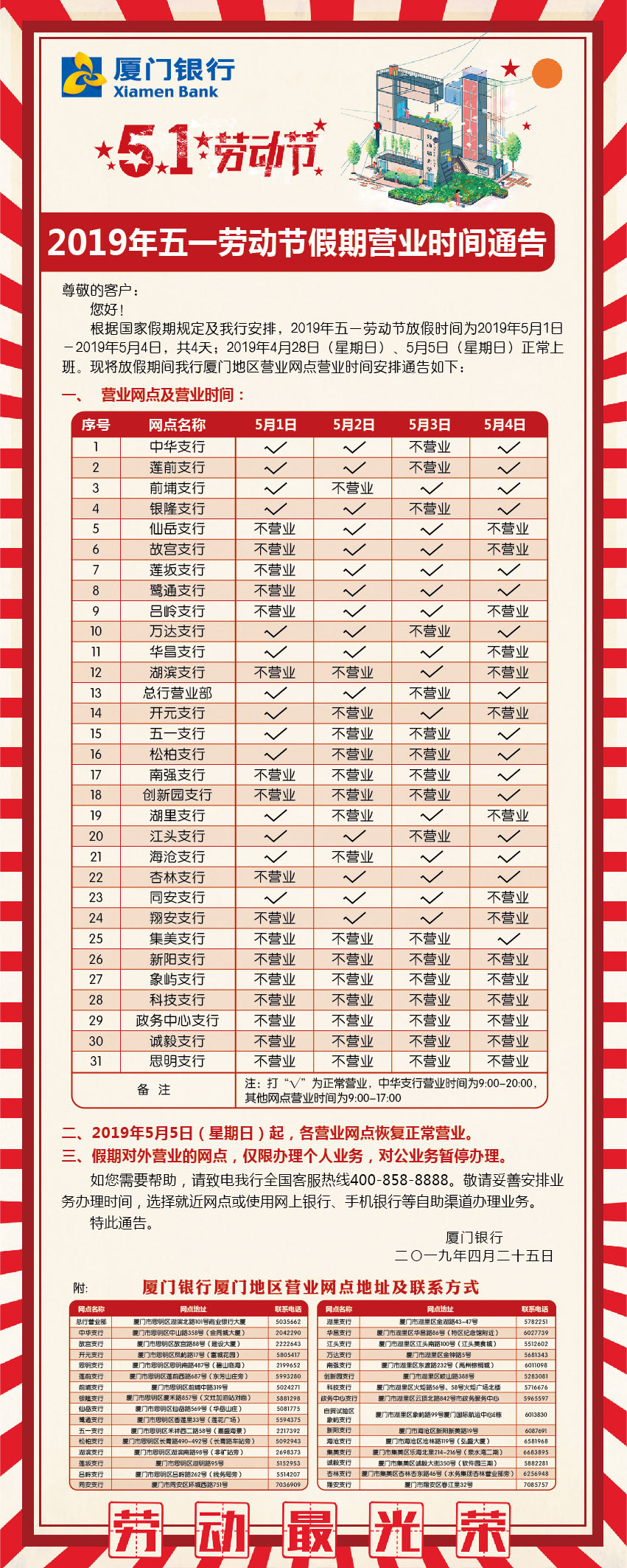 2019年廈門銀行廈門地區(qū)五一假期各網(wǎng)點營業(yè)時間