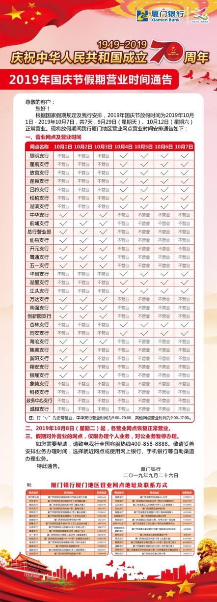 2019年國慶節(jié)假期營業(yè)時間通告