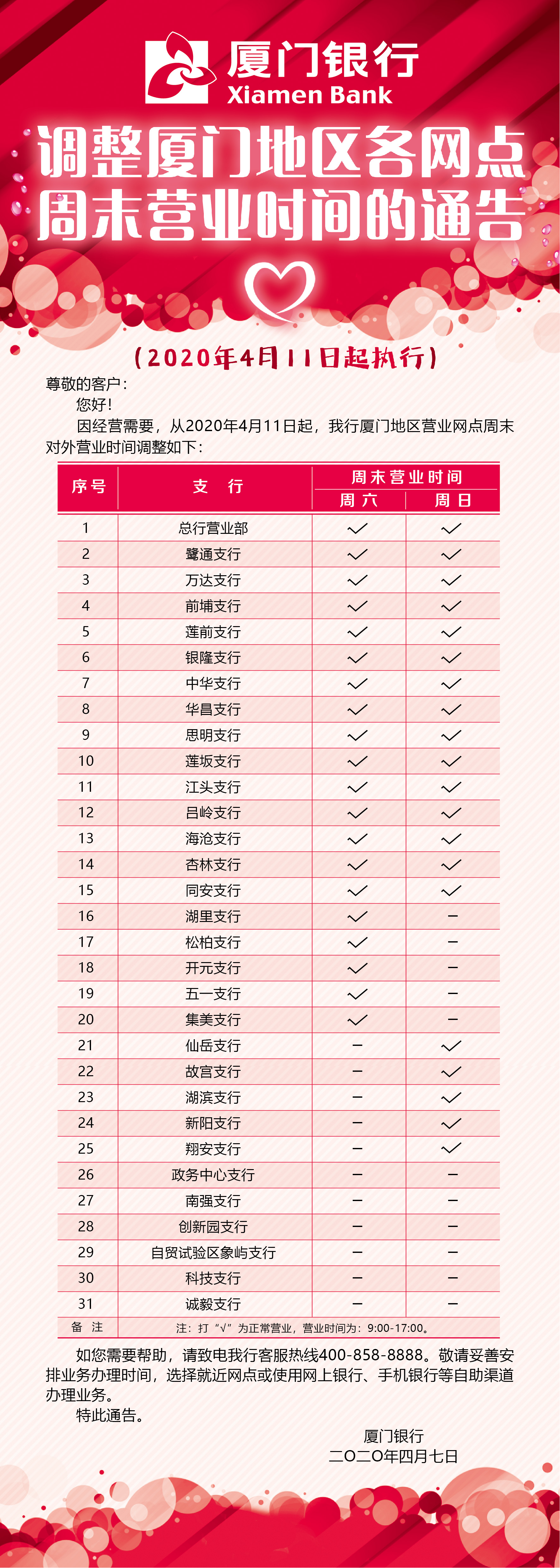 廈門銀行關(guān)于調(diào)整廈門地區(qū)各網(wǎng)點(diǎn)周末營業(yè)時(shí)間的通告