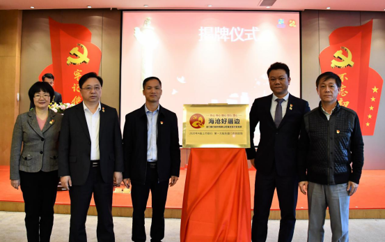 海滄區(qū)委組織部副部長(zhǎng)、區(qū)委非公工委副書記葉偉民(左三)與廈門銀行海滄支行黨支部書記、新陽(yáng)支行行長(zhǎng)林锽钅泉(右二)共同為廈門銀行海滄支行黨支部黨建品牌揭牌。