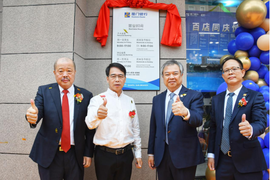 廈門(mén)銀行行長(zhǎng)吳昕顥、前埔支行行長(zhǎng)謝建平和廈門(mén)市思明區(qū)政協(xié)副主席許建民、富貴鳥(niǎo)(廈門(mén))科技集團(tuán)有限公司董事長(zhǎng)洪頂超共同為支行開(kāi)業(yè)揭牌