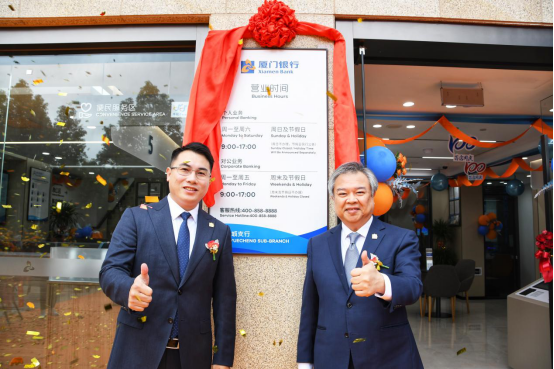 廈門銀行行長(zhǎng)吳昕顥、灣悅城支行行長(zhǎng)黃恒福共同為支行開業(yè)揭牌