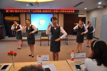 為慶祝廈門銀行重慶分行成立6周年,重慶分行工會(huì)委員會(huì)聯(lián)合分行營運(yùn)管理部,圍繞“立足營運(yùn) 助力營銷”的經(jīng)營理念,于6月10日開展了重慶分行2017年“心手相連 承諾百年”柜面服務(wù)技能競賽。分行行領(lǐng)導(dǎo)、各部門負(fù)責(zé)人,以及營運(yùn)條線共41名柜面人員參加了本次競賽活動(dòng)。競賽項(xiàng)目包括業(yè)務(wù)技能競賽、營運(yùn)業(yè)務(wù)知識(shí)競賽、服務(wù)禮儀情景展示。