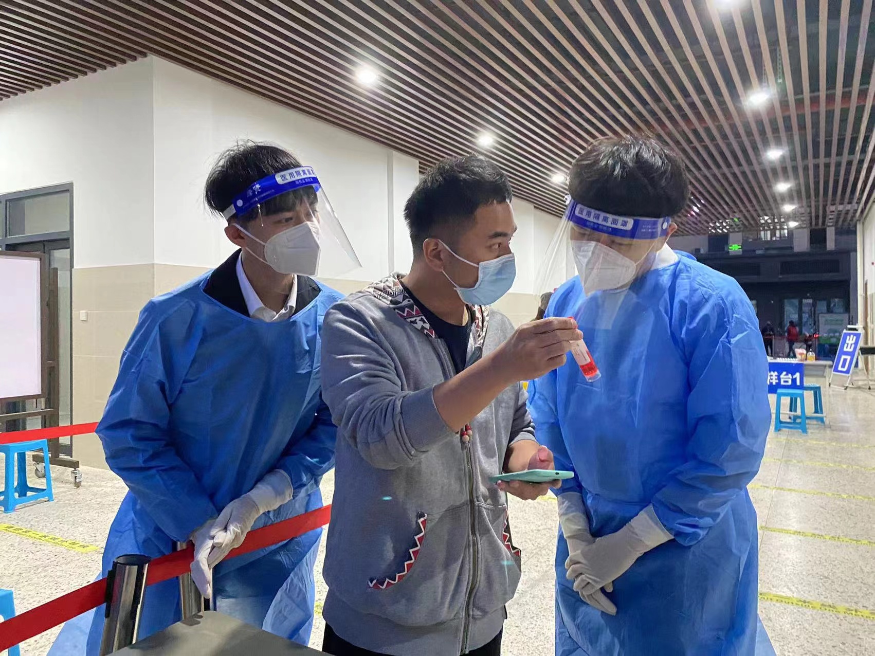 為確保檢測(cè)有序進(jìn)行,志愿者們?cè)诓煌瑣徫桓魉酒渎殻龑?dǎo)現(xiàn)場群眾排隊(duì)、協(xié)助信息采集、為醫(yī)護(hù)人員提供后勤保障。“請(qǐng)先掃碼”“請(qǐng)這邊排隊(duì)”……簡單的語言和動(dòng)作重復(fù)了上百次,有的志愿者喉嚨已沙啞,但他們?nèi)员M忠職守,堅(jiān)守一線,用實(shí)際行動(dòng)筑起堅(jiān)實(shí)防線。