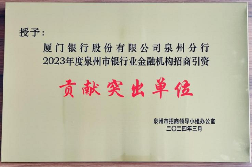泉州分行榮獲“2023年度泉州市銀行業(yè)金融機構(gòu)招商引資貢獻(xiàn)突出單位”
