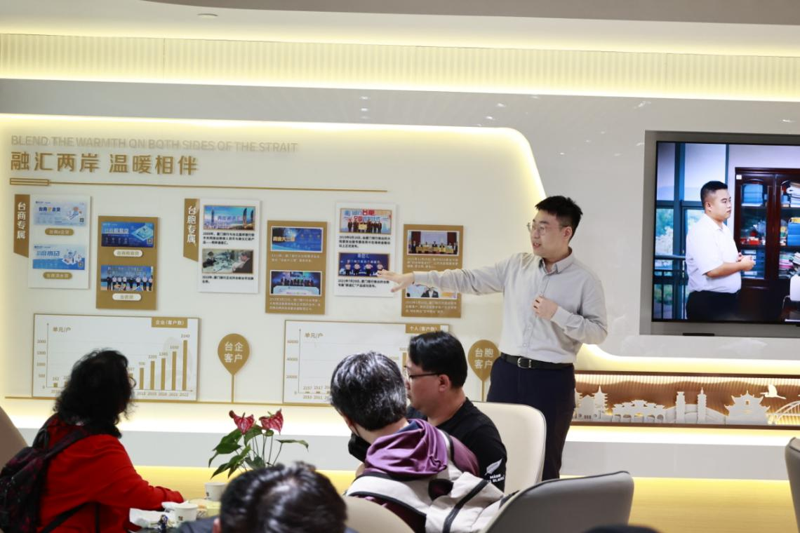 4月25日,臺胞一行參觀廈門銀行南平分行整體布局和“臺商之家”特色服務展廳,了解廈門銀行對臺金融合作、兩岸文化交流等方面推出的特色金融產品,提供的便利化服務和打造亮點活動?,F場,廈門銀行臺籍員工代表向此次來訪的臺胞們分享了在陸工作經歷和感受,廈門銀行南平分行行長助理李劍深入跟臺胞交流。