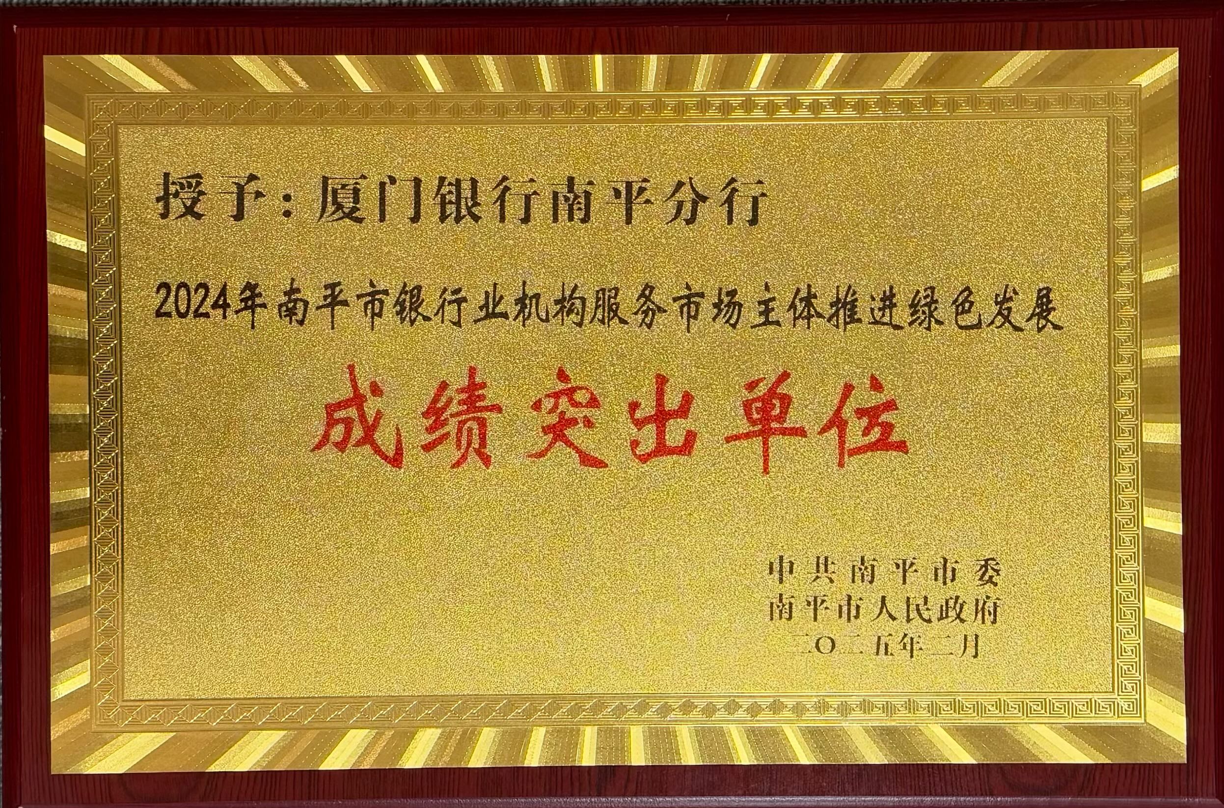 根據(jù)《南平市銀行業(yè)機(jī)構(gòu)服務(wù)市場主體推進(jìn)綠色發(fā)展評價(jià)辦法》,經(jīng)綜合評價(jià),廈門銀行南平分行獲評“2024年南平市銀行業(yè)機(jī)構(gòu)服務(wù)市場主體推進(jìn)綠色發(fā)展成績突出單位”。廈門銀行南平分行連續(xù)兩年獲得該項(xiàng)表揚(yáng),肯定了我行在南平市銀行業(yè)機(jī)構(gòu)服務(wù)市場主體、推進(jìn)綠色發(fā)展工作中取得優(yōu)異表現(xiàn),也激勵(lì)著我行繼續(xù)為南平市全方位綠色高質(zhì)量發(fā)展做出更多貢獻(xiàn)。
