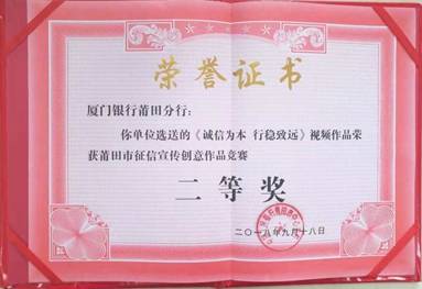 廈門(mén)銀行莆田分行喜獲莆田市征信宣傳創(chuàng)意作品競(jìng)賽二等獎(jiǎng)
