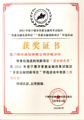 7月28日,寧德分行選送的創(chuàng)新項目“茶農(nóng)助農(nóng)貸”在2021年度寧德市普惠金融改革試驗區(qū)“普惠金融創(chuàng)新項目”評選活動中榮獲三類項目獎。