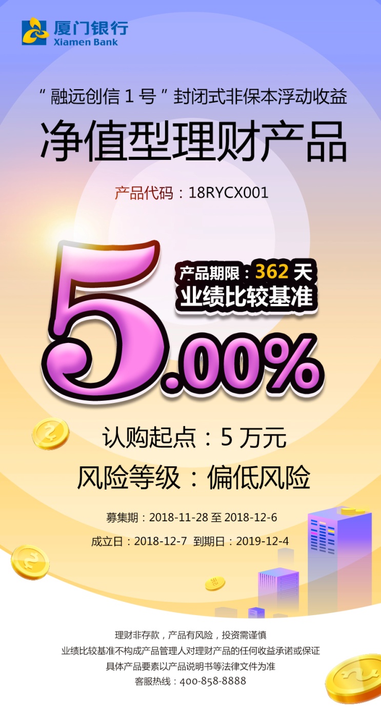 "融遠(yuǎn)創(chuàng)信1號"封閉式非保本浮動收益凈值型理財(cái)產(chǎn)品 日期:2018-11-27 17:38:46 廈門銀行融遠(yuǎn)創(chuàng)信1號 凈值型理財(cái)產(chǎn)品 2018年11月28日起發(fā)行 上一篇 返回 下一篇