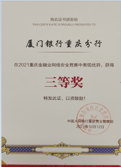 廈門銀行重慶分行榮獲2021年重慶金融業(yè)網(wǎng)絡(luò)安全競賽”三等獎”